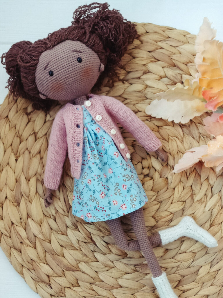 Several years I created jewellry with miniature crochet flowers, still have threads, dyes and supplies to continue. But I fell in love with crocheting dolls and clothes for them. I mostly prefer knitted clothes, in this case clothes are more soft and looks more “like for humans” and I love it. For example, crocheted doll and knitted cardigan on the picture below: