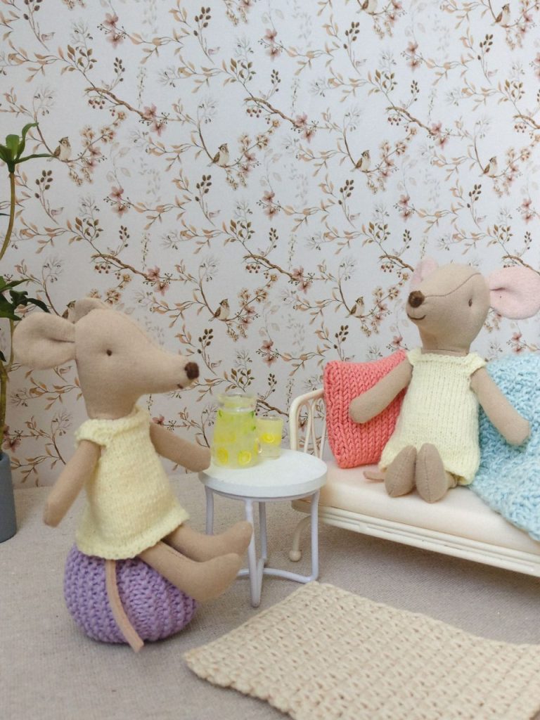 Knitting, sewing, arranging tiny rugs and pillows — it’s slow, meditative work. And when a blanket is finished or a mouse’s outfit is ready, the scene finally feels alive. Tiny props — a teacup, a little book, a matchbox bed — suddenly complete the corner, creating a quiet joy that only someone who loves miniatures truly understands.