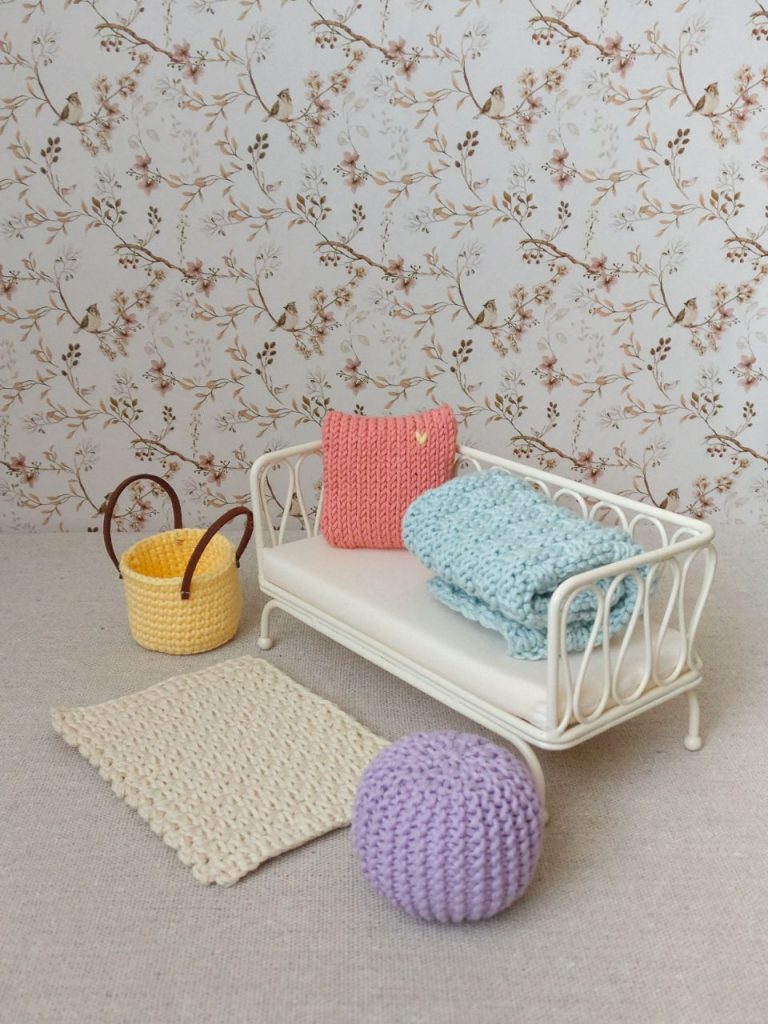 The idea came naturally. I wanted to make hand-knitted sets for them — not just a summer blanket, but a winter one too, something warm and soft to snuggle under. And then a spring set, bright and cheerful, full of pastel colors and fresh energy. Each blanket, each little accessory, adds a tiny story to their miniature world.